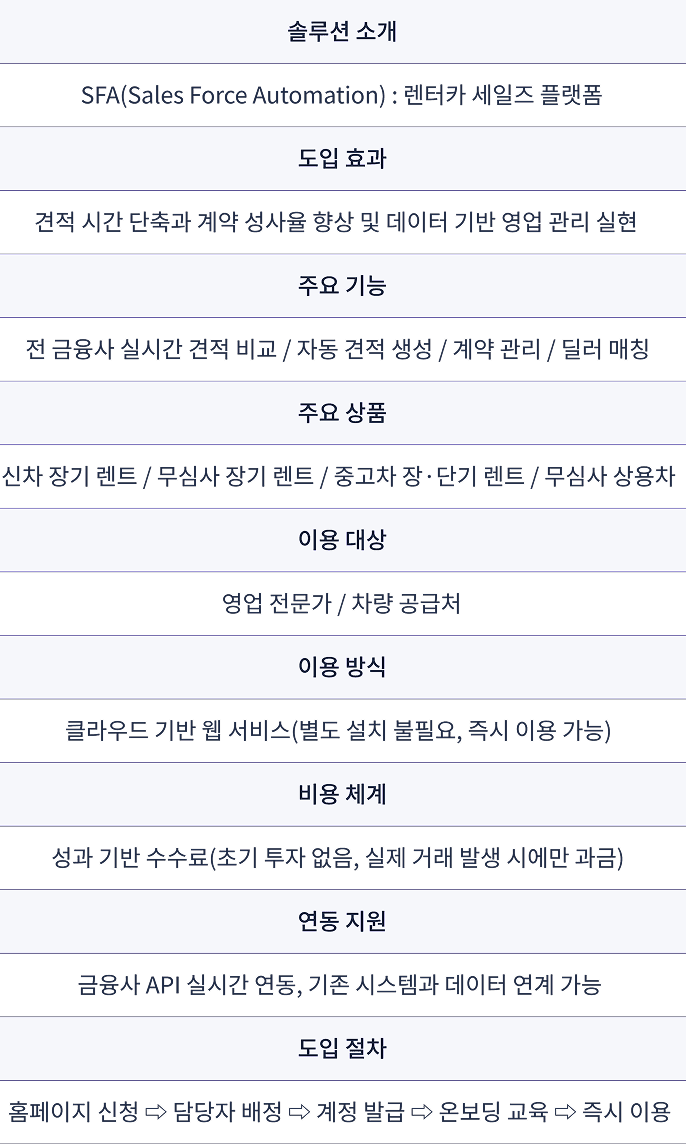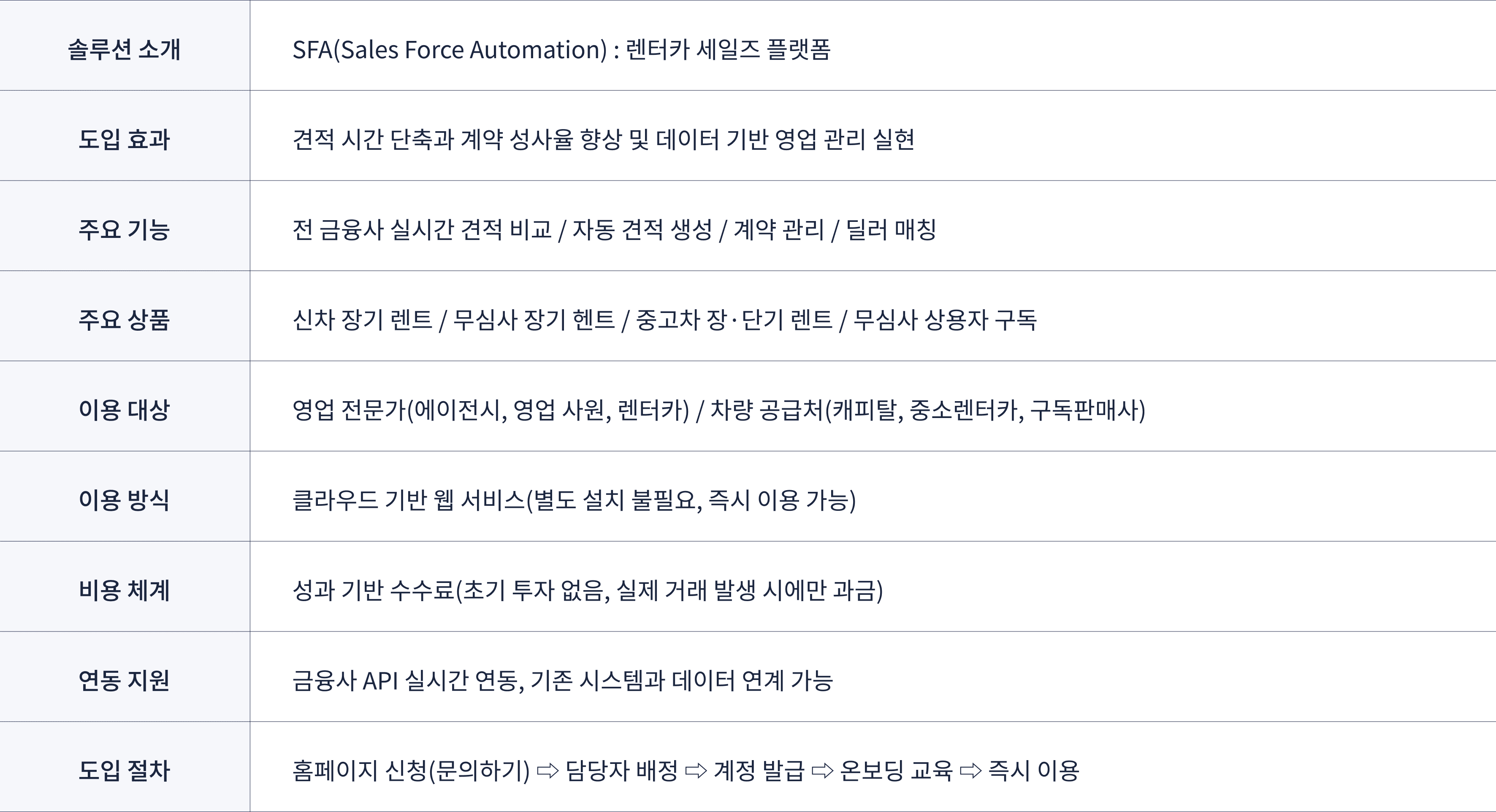 렌터카 세일즈 플랫폼『SFA』와 온디맨드 모빌리티 통합 플랫폼『모빌러그』가 결합된 토털솔루션으로 전 생애주기를 관리합니다.