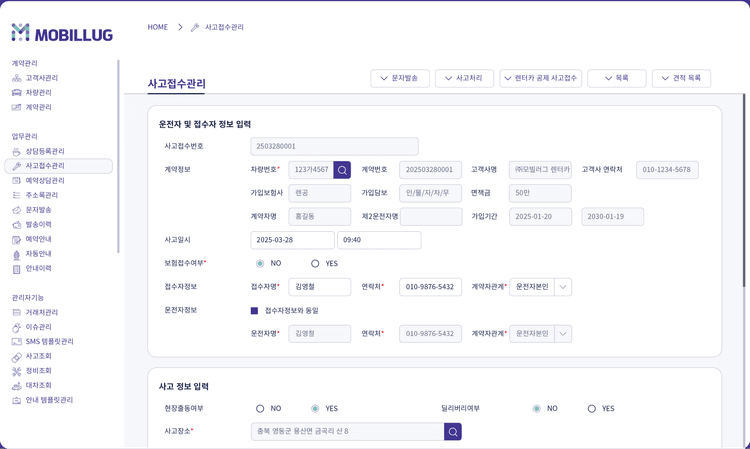 고객 차량을 실시간으로 관리하는 렌터카 운영 통합 플랫폼입니다. 출고 상품화, 24시간 고객관리, 대차 중개, 손해사정 서비스를