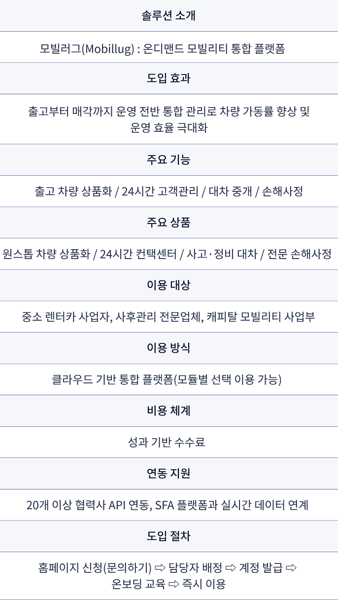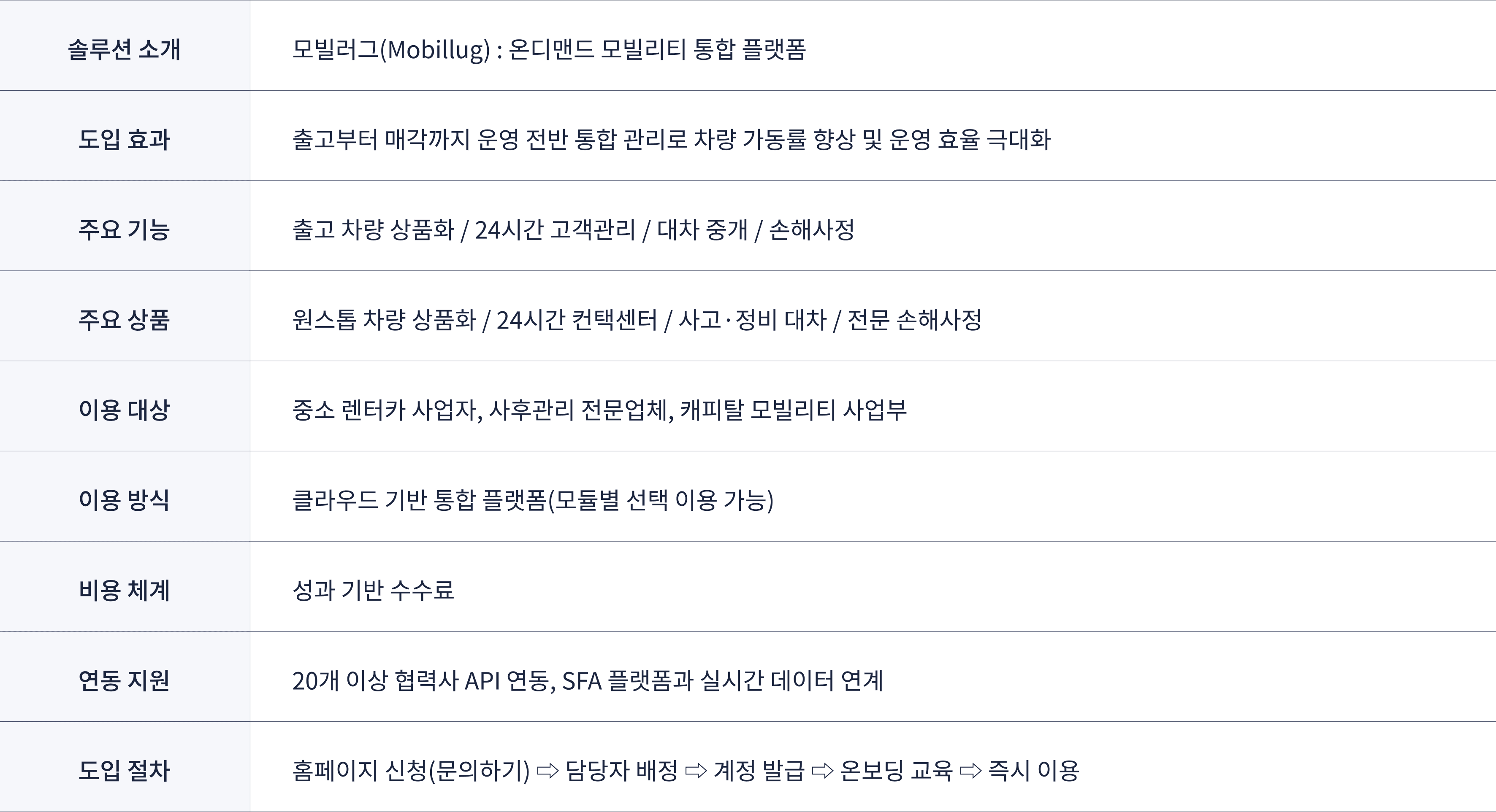 렌터카 세일즈 플랫폼『SFA』와 온디맨드 모빌리티 통합 플랫폼『모빌러그』가 결합된 토털솔루션으로 전 생애주기를 관리합니다.