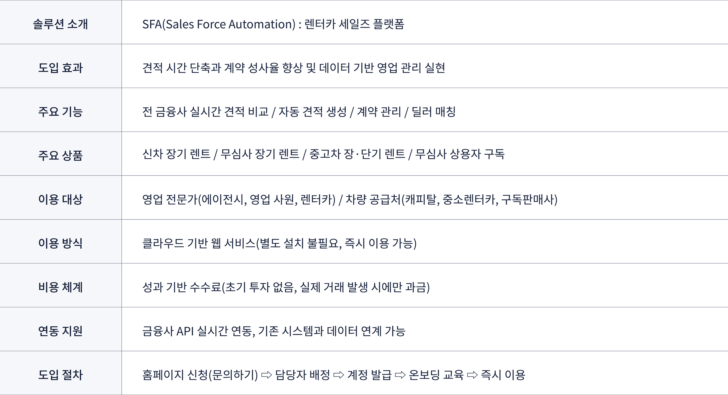 렌터카 세일즈 플랫폼『SFA』와 온디맨드 모빌리티 통합 플랫폼『모빌러그』가 결합된 토털솔루션으로 전 생애주기를 관리합니다.